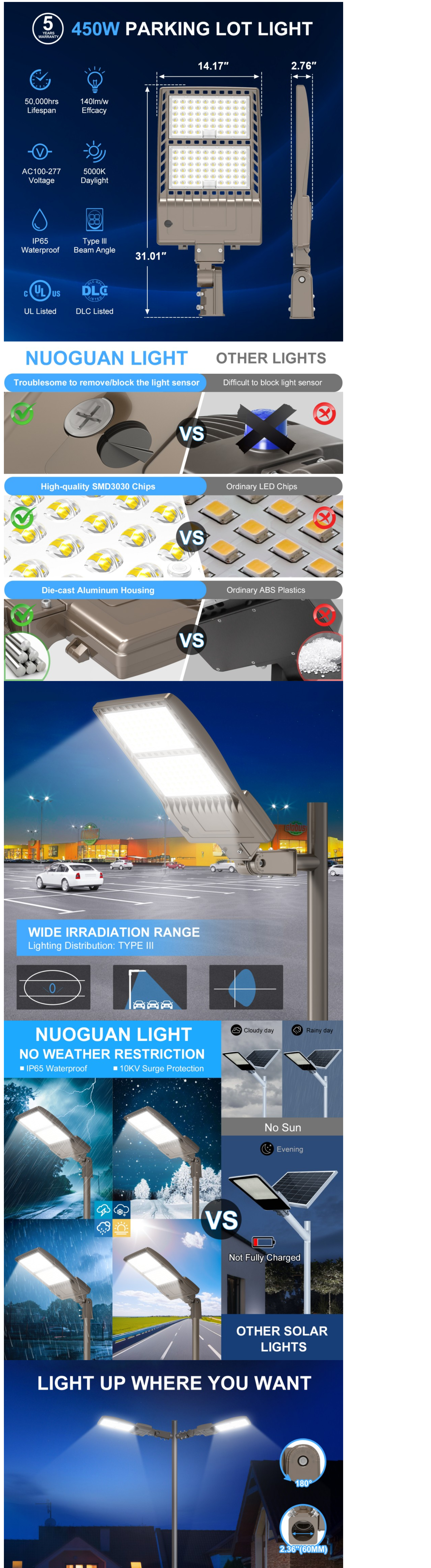 | VE-NSB-450W | 450W | 100~277V | 464pcs SMD3030 | 63000Lm | 140LM/W | UL Driver | 788*360mm | Built-in photocell |