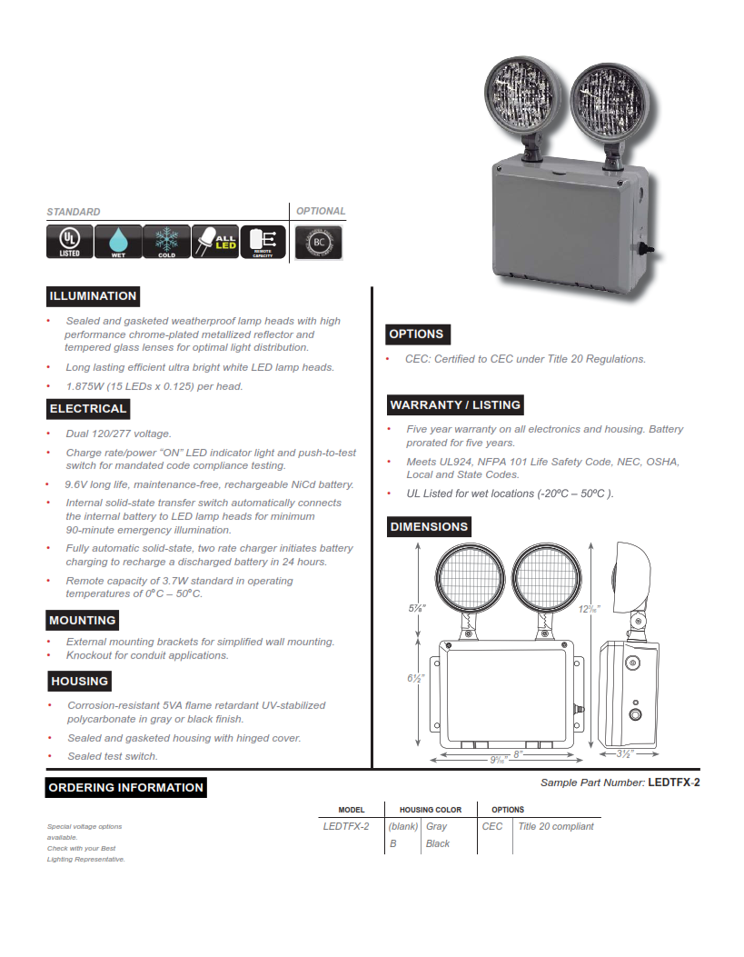 Quick view Details sku: LEDTFX-2 LEDTFX-2 Wet Location Remote Capable LED Emergency Light MSRP: Now: $139.95 Choose Options Quick view Details 2 Head Wet Location Emergency MSRP: Now: $65.95 Add to Cart Quick view Details sku: CWLEZXTEU Wet Location All LED Exit and Emergency Polycarbonate Combo MSRP: Now: $201.00 Choose Options Quick view Details Value Engineered Lighting Compact Wet Location LED Exit sign MSRP: Now: $99.95 Choose Options Quick view Details sku: RMR-16-65/125 MR-16 Remote Capable Thermoplastic Emergency Unit MSRP: Now: $115.00 Choose Options